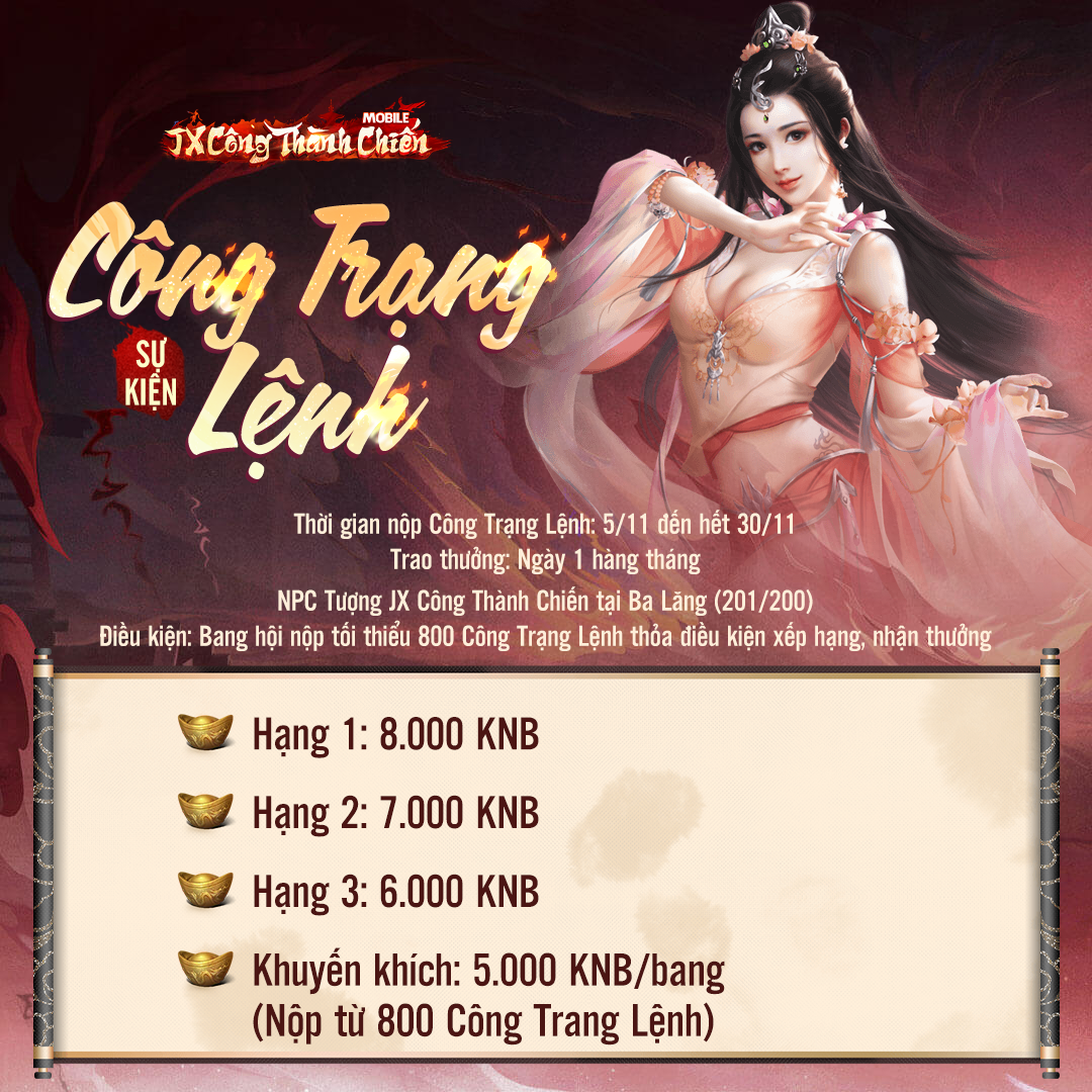 Phần thưởng: Công bố hàng tháng tại fanpage JX Công Thành Chiến Mobile